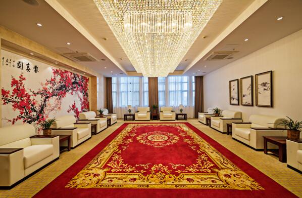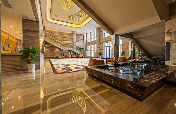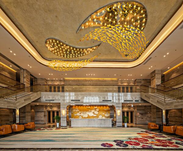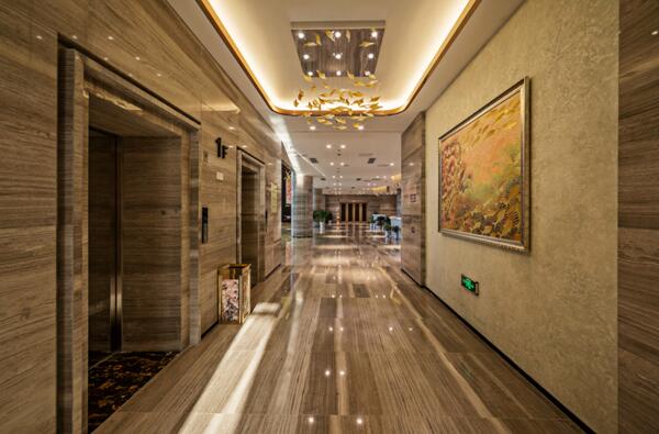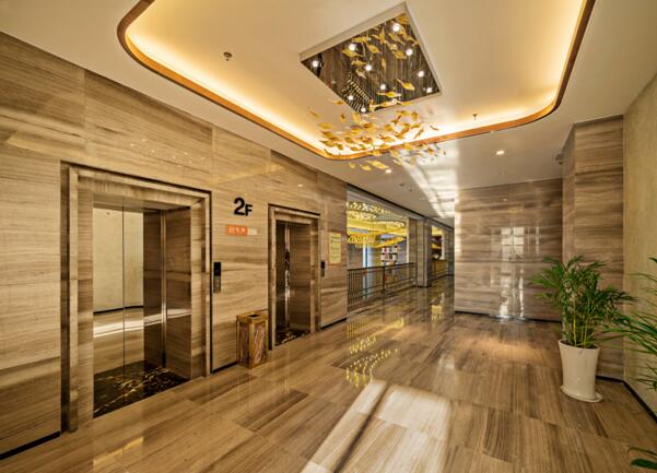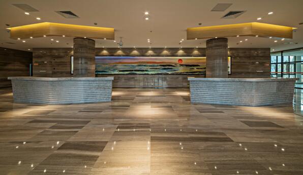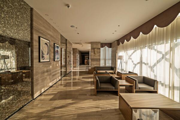 空間采用對稱設(shè)計手法, 強調(diào)色調(diào)的中性與柔和, 以木紋石為主要材料, 頂面造型與地面上下呼應(yīng), 地毯的運用溫暖了接待大堂。桔色休息椅對稱布置于大堂兩側(cè), 靠近梯段下的景觀區(qū), 合理設(shè)置, 滿足使用。