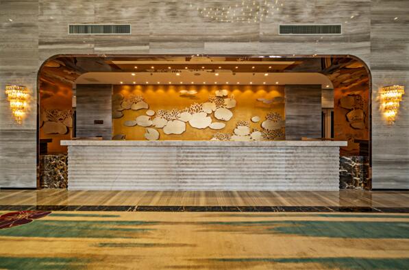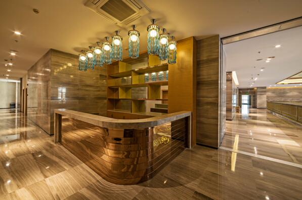 古銅色不銹鋼與藍色造型燈 木紋石材, 構(gòu)成了服務(wù)臺的造型。