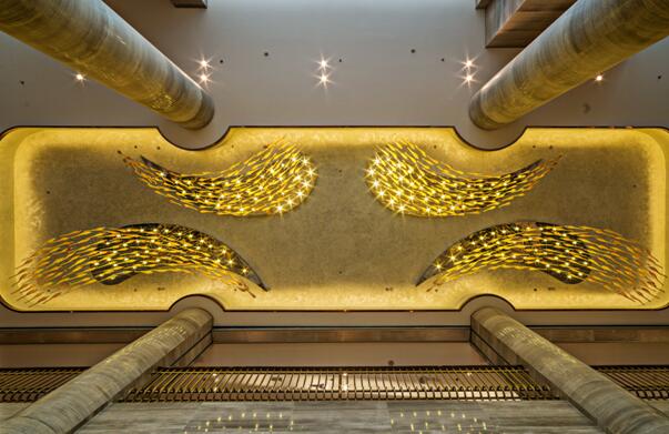 木格造型規(guī)則排列, 與鏡面不銹鋼形成視覺上的錯覺, 豐富了空間的色彩和肌理。