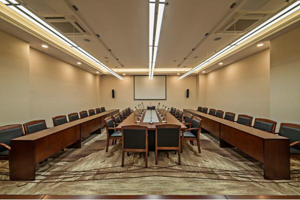 長條燈帶與條形桌形成統(tǒng)一, 室內(nèi)空間整體簡潔, 米色墻紙搭配地毯, 符合空間特征。
